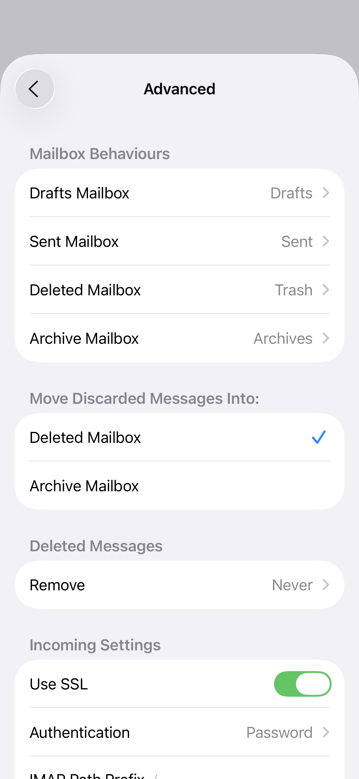 1. The first step is to make sure you’ve read incoming mail on the device at least once, this is important, otherwise Mailbox Behaviours will not be visible. Why Apple won't let people configure it at account creation, we don't know.